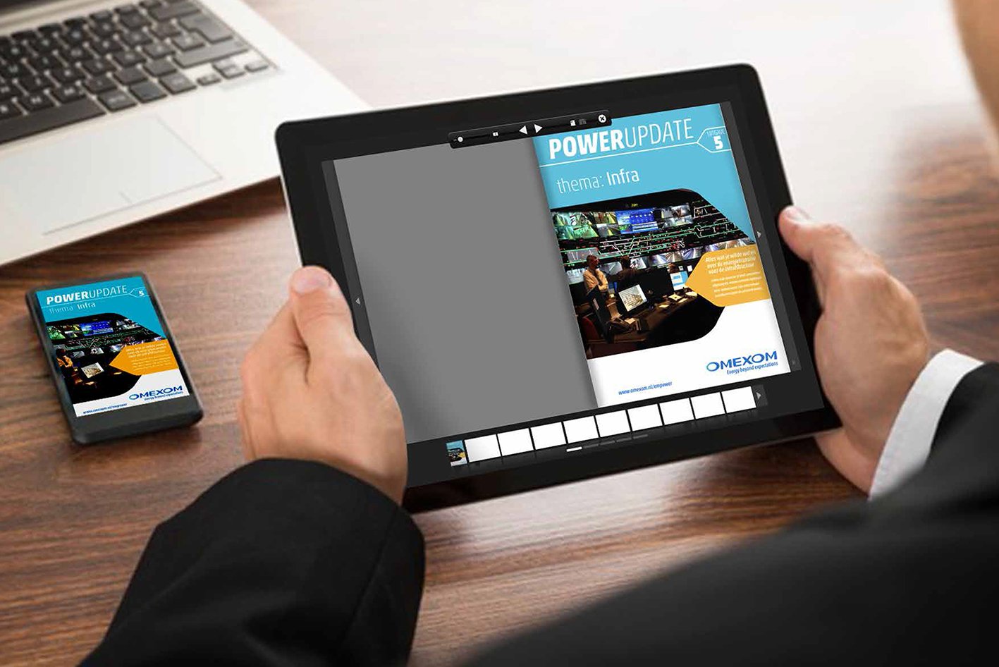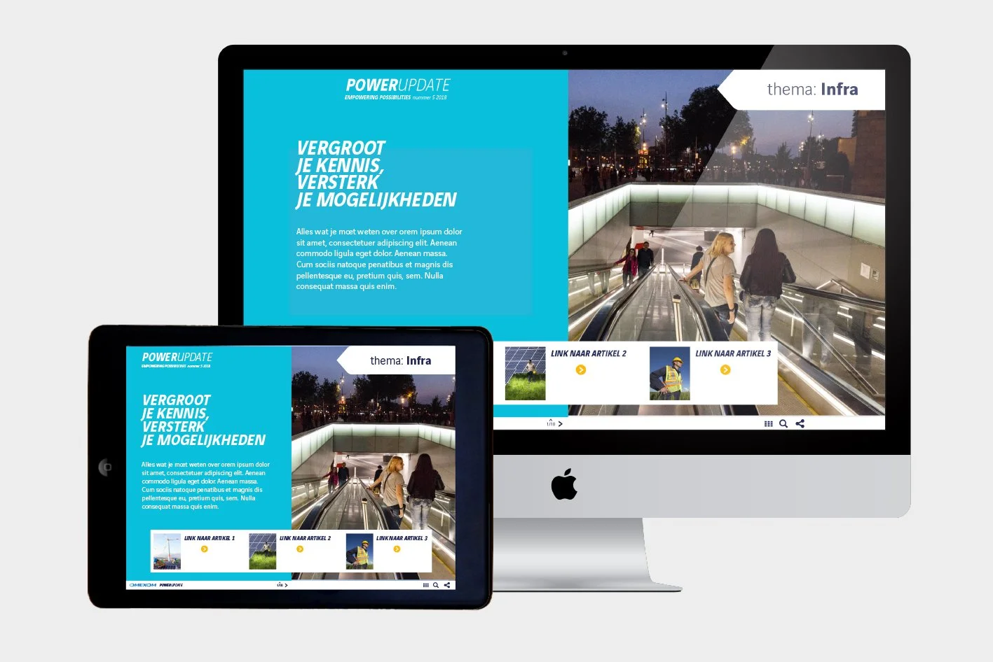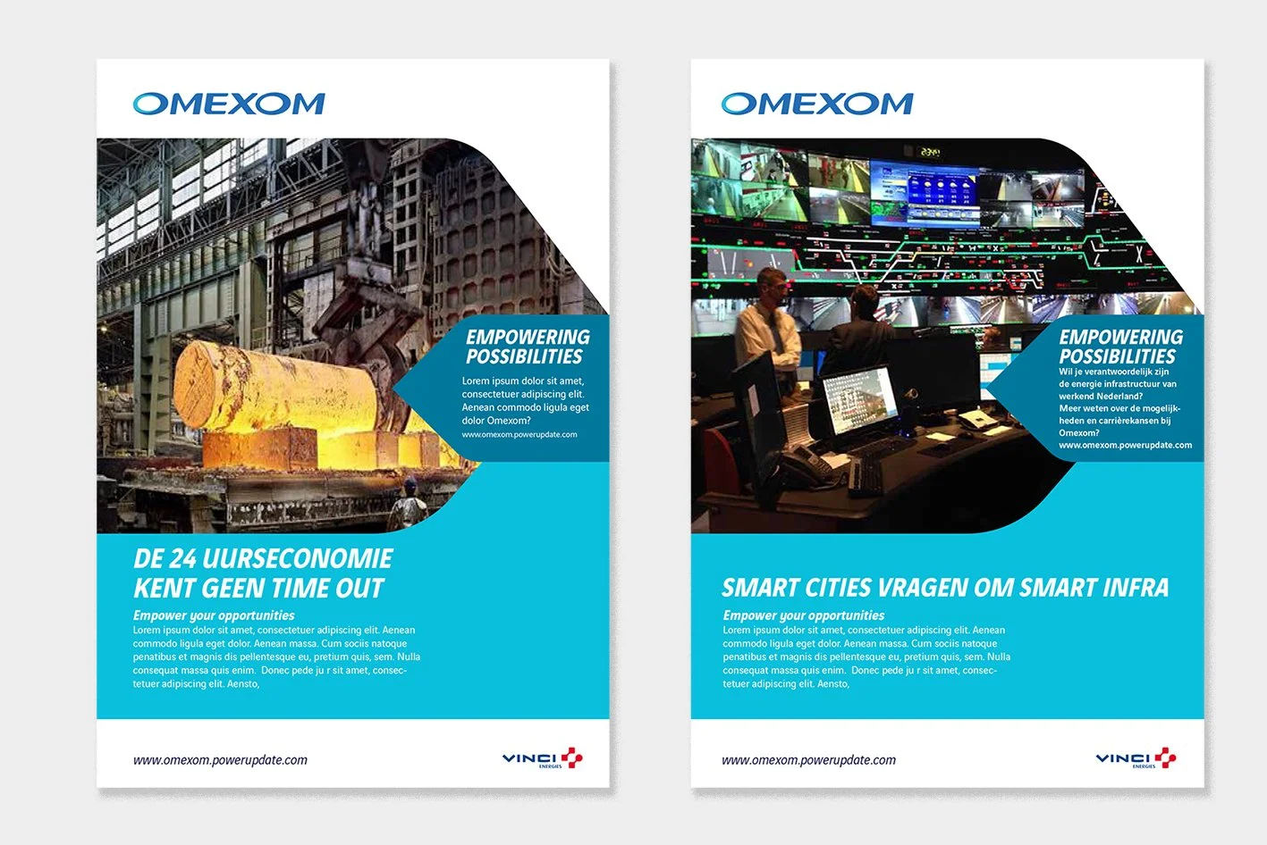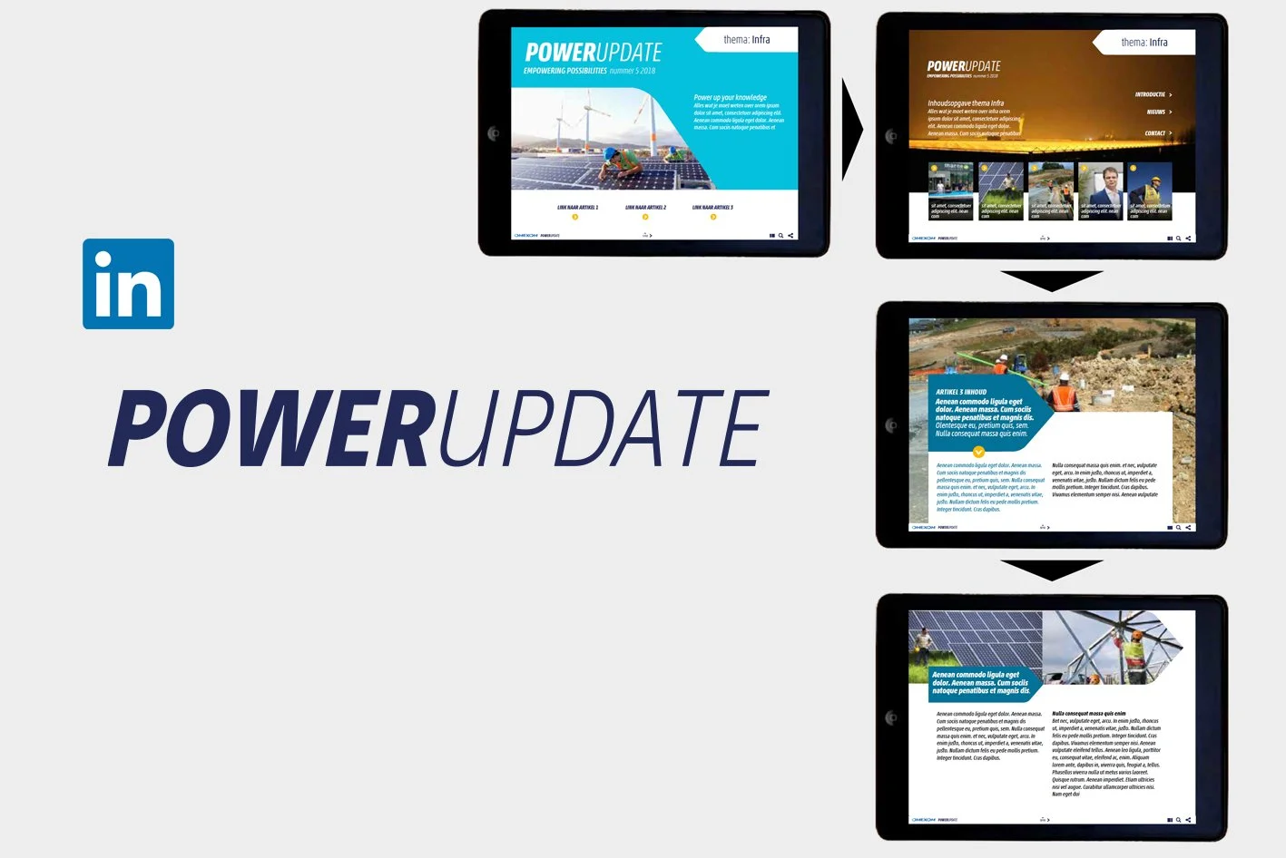 Wij vertaalden de merkbelofte naar het communicatiethema Empowering possibilities. Waarbij we gebruik maakten van de visuele stijl van stroomschema’s. Als dragend communicatiemiddel ontwikkelden we de PowerUpdate, een terugkerend e-magazine. Dit online platform bundelt verhalen over projecten, innovaties en mensen. Het verbindt interne en externe doelgroepen en laat concreet zien hoe Omexom de energietransitie mogelijk maakt.