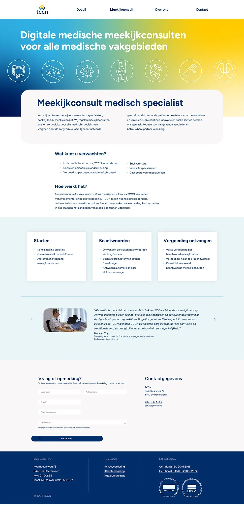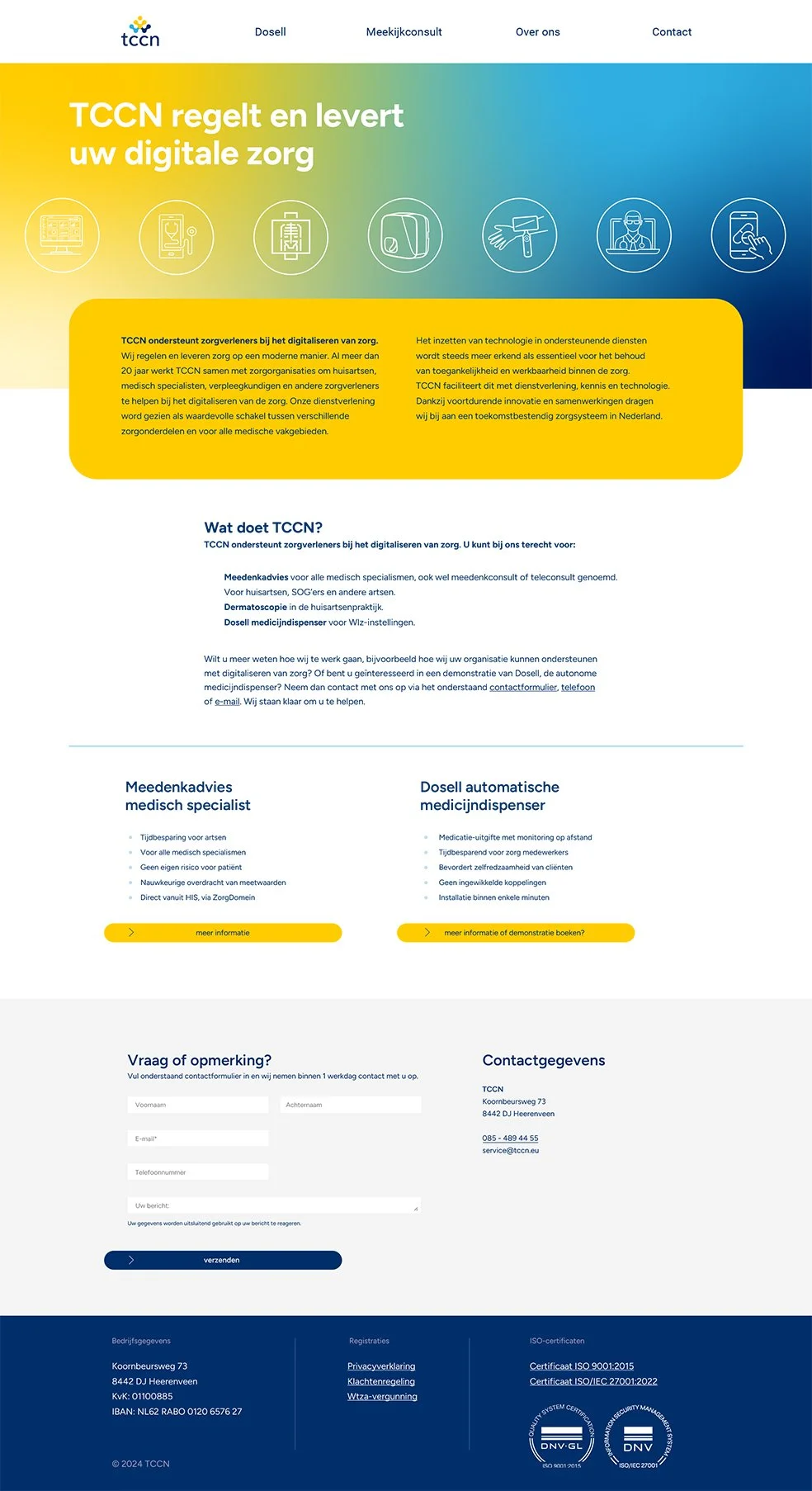 TCCN heeft nu een merk dat klopt met wie ze zijn en hoe ze werken. De uitstraling is krachtig, eigentijds en onderscheidend binnen de zorg. De website en campagnes zorgen voor meer duidelijkheid, meer herkenning en een stevige basis om verder te groeien als zorginnovator. Daarnaast ondersteunen we TCCN met het in de markt zetten van Dosell een automatische medicijndispenser.